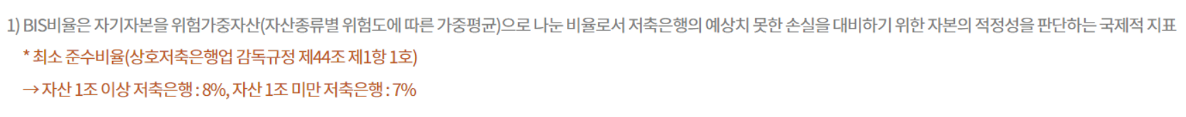 BIS비율은 금융기관이 자체적으로 위험에 대비해 얼마나 충분한 자금을 가지고 있는지를 비율로 알려주며 국제적 지표로 사용됩니다. 높을 수록 안전하며 8% 이상이면 안전하다고 판단하고 있습니다.