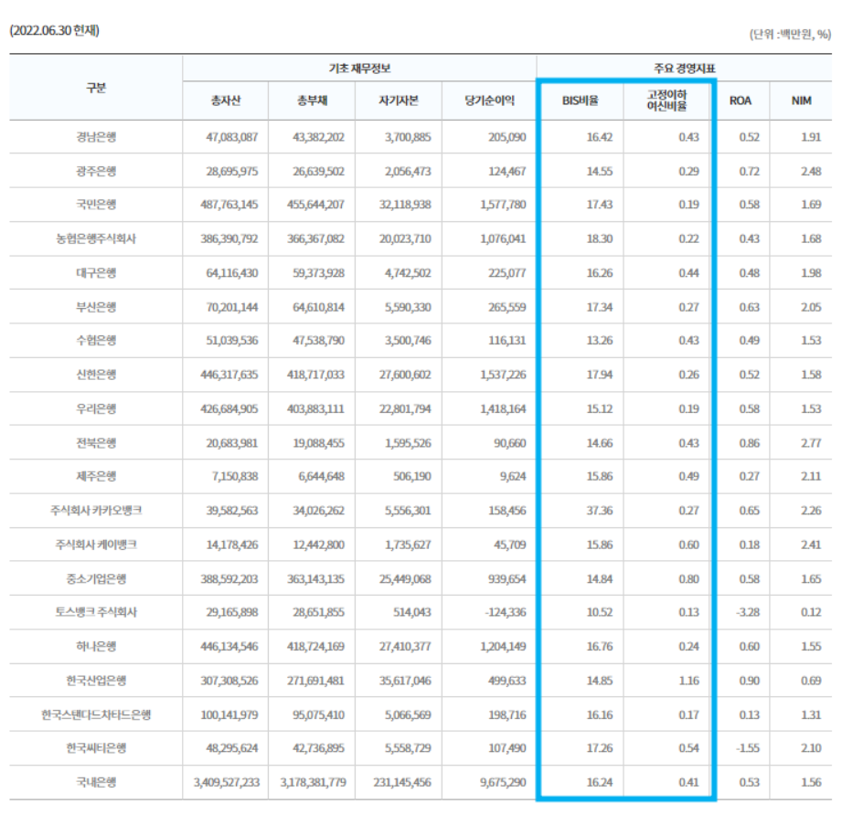 이 외에도 은행이 수익을 얼마나 잘 내고 있는지 알려주는 ROA(총자산(순)이익률), 높을 수록 안전한 유동성 비율, 당기순이익, 연체율 등을 점검해보면 은행 건전성을 확인하는데 도움이 됩니다.