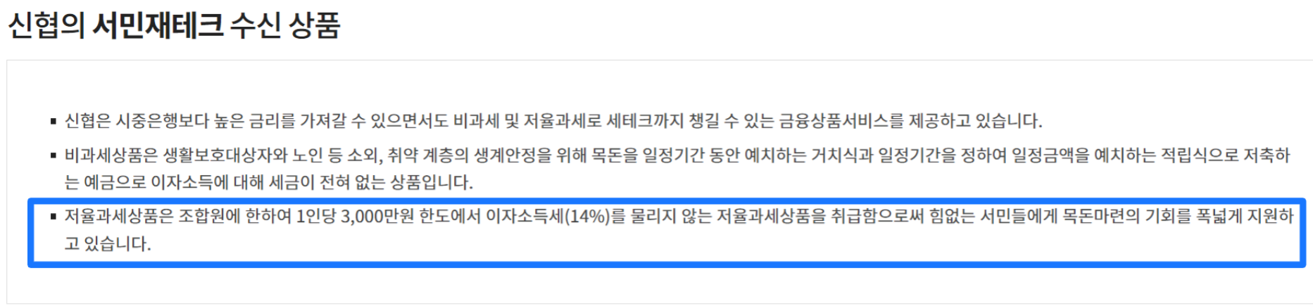 일반 과세는 예금·적금 상품의 만기에 15.4%의 이자소득 원천징수세를 내야합니다. 하지만 저율과세를 받게 되면 농특세인 1.4%만 내면 되기 때문에 사실상 더 높은 금리의 정기 예금에 가입한 것과 같은 효과가 있죠.