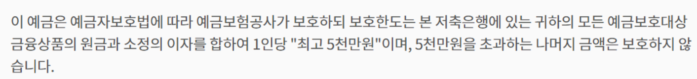 예금자 보호한도는 5천만원이라는 사실 많이 알고 계시죠. 원금과 이자를 합한 금액으로 만기 해지 금액이 이자를 포함하여 5천만원 이내인 경우에 5천만원 전체를 보호 받는 것입니다. 그러니 예치할려는 금액이 클 경우에는 은행 별로 나누어 분산하시는 것이 바람직 합니다.