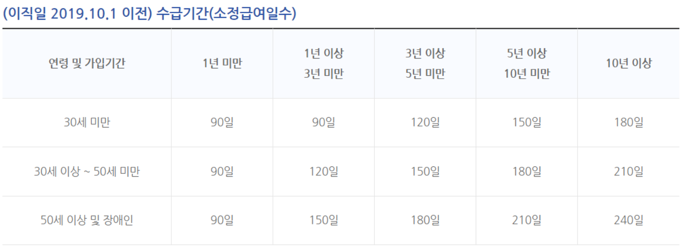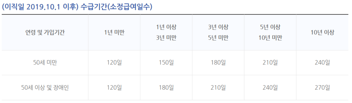 업급여 수급기간은 나이, 월급, 근무한 기간에 따라 달라진다고 합니다. 수급 기간은 최소 120일에서 최대 270일까지라고 합니다.