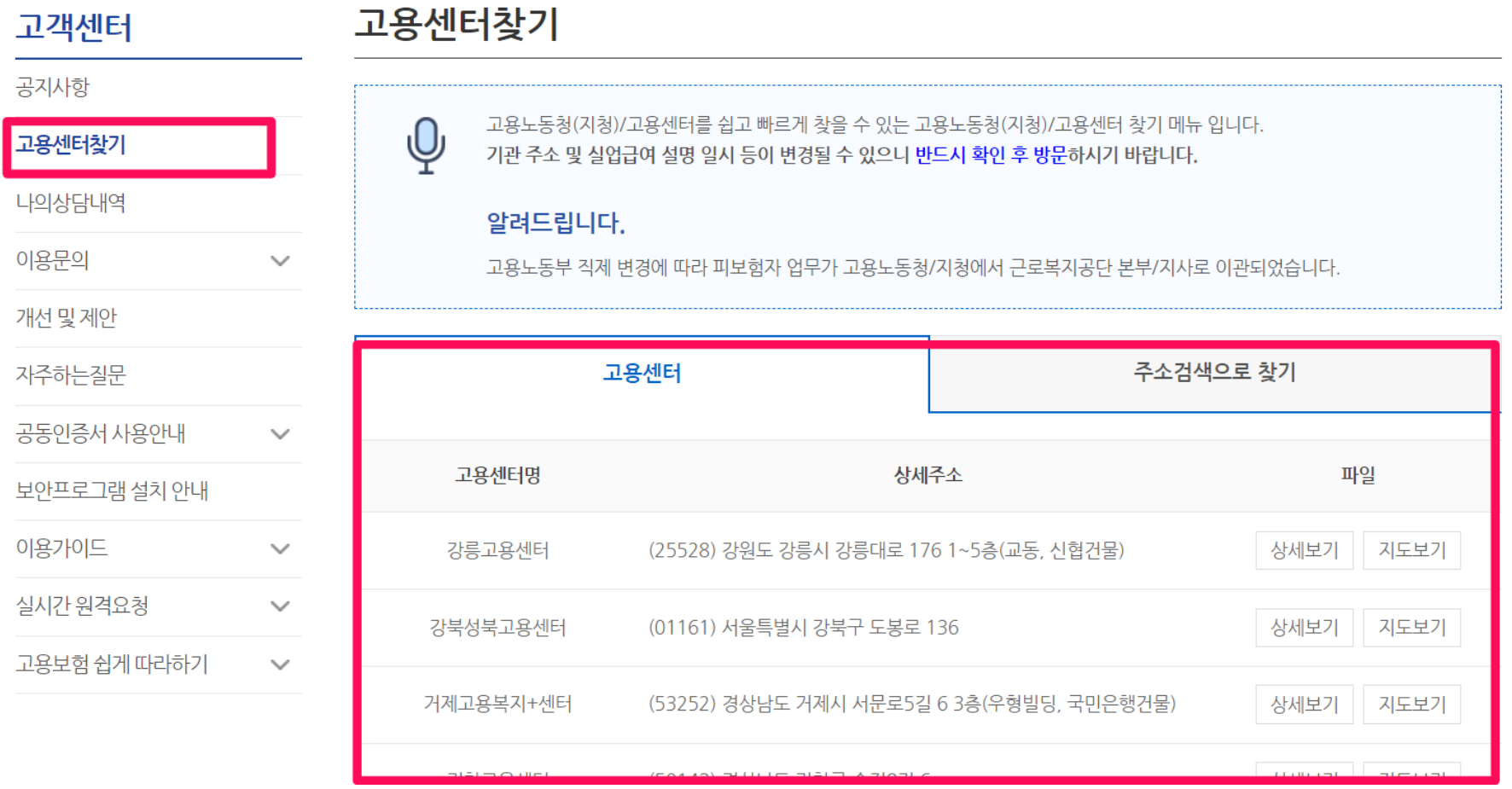 무엇보다 실업급여 조건 상 퇴사 후 1년이 지나면 지급을 받을 수 없기 때문에 퇴직 후 고용센터를 바로 방문하여 상담을 받는 것이 좋습니다. 거주지 관할 고용센터는 다음의 고용보험 홈페이지에서 고용센터찾기를 통해 찾으실 수 있습니다.