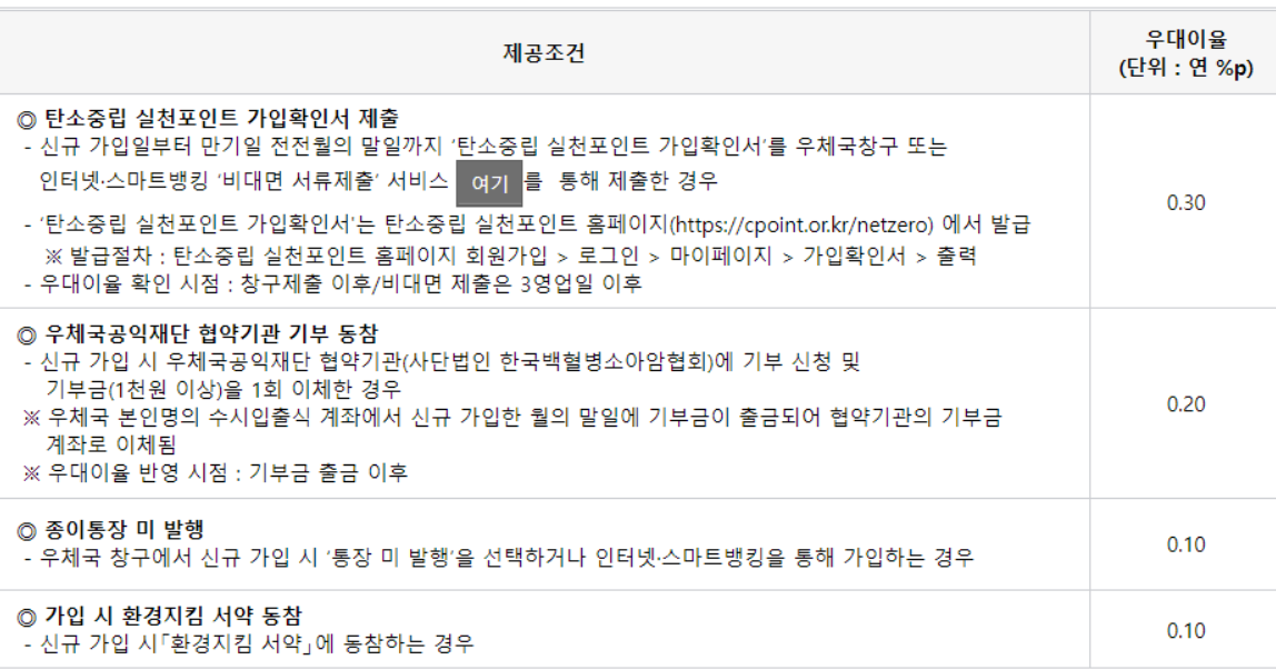 우대 금리 조건을 살펴보면 통장 발행 없이 거래하는 고객에게 우대 금리를 제공하고 있으며 환경 친화적 목적으로 상품을 설계하고 있으며 디지털 채널(인터넷, 스마트뱅킹)을 통해서만 가입이 가능합니다.