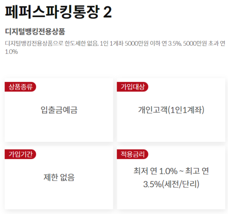 페퍼저축은행의 페퍼스파킹통장2는 비대면 전용상품으로 모바일 앱 ' 디지털페퍼'를 통해 가입할 수 있습니다. 1인 1계좌를 5천만원의 한도로 가입할 수 있습니다. 모바일 뱅킹 이체 시에는 수수료 면제 혜택이 있어 좋습니다.