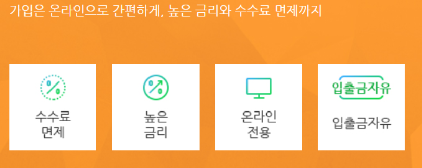 온라인 전용 상품으로 높은 금리 혜택을 주면서 수수료 면제 혜택까지 포함한 입출금통장입니다. 1인1계좌만 가입이 가능합니다. 가입금액 한도는 없지만 예금자 보호 한도 내로 이용하시면 좋겠습니다.