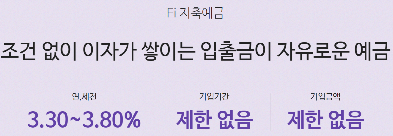 다올저축은행의 Fi저축예금은 가입 기간과 가입 금액에 제한이 없는 것이 가장 큰 장점입니다. 또한 우대 조건 충족 시, 우대금리를 받아 최고 3.8%의 금리 혜택을 받을 수 있습니다.
