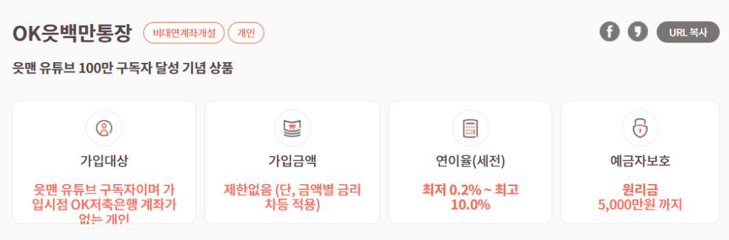 OK저축은행 OK읏백만통장은 12월 13일부터 12월 31일 까지 판매되는 특판 입출금통장 상품입니다. OK저축은행 유튜브 채널의 구독자 수 100만명 돌파를 기념해 출시 되었습니다. OK저축은행 모바일 앱 전용 상품입니다.