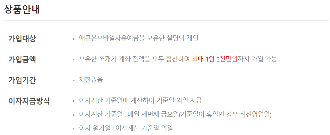 애큐온저축은행의 머니쪼개기는 모바일전용상품으로 1인 최대 5개의 계좌를 만들어 사용할 수 있습니다. 5개의 계좌 잔액은 모두 합산하여 최대 1인 2천만원까지만 가입이 가능합니다.