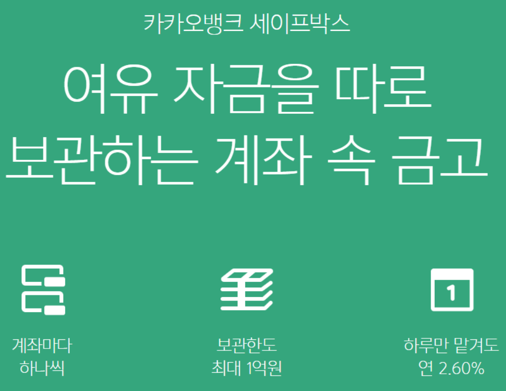 카카오뱅크의 세이프박스는 1인 1계좌로 가입이 가능합니다. 예치 한도는 최대 1억원입니다.