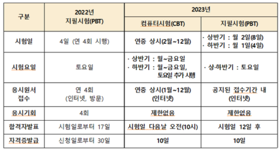 2023년 부터는 요양보호사 시험일정이 변경되어 더 자주 치뤄집니다. 2022년 까지는 연 4회에 걸쳐 시행되던 요양보호사 시험일정이 상시 시험 시행으로 변경됩니다. 상시 시험 시행으로 응시자들은 본인이 원하는 국시원(한국보건의료인국가시험원) 시험센터 및 시험 시간(오전/오후)을 선택하여 응시할 수 있습니다. 또한 합격자 발표도 47일에서 10일로 단축되어 시험 결과를 더 빠르게 알 수 있게 되었습니다. 요양보호사 자격증 취득방법이 더 쉬워지겠습니다.