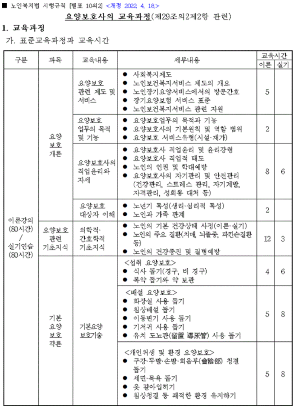 요양보호사 자격증 취득방법은 교육과정 이수자를 대상으로 한국보건의료인국가시험원이 주체하는 요양보호사 시험을 통과하여 자격증을 취득하여야 자격이 주어지는 국가전문자격증입니다. 요양보호사 시험 교육 과정은 약 2달 간의 이론 교육과 1주일 간의 시설 실습, 그리고 1주일의 간의 재가(가정) 실습으로 나뉘어 집니다.