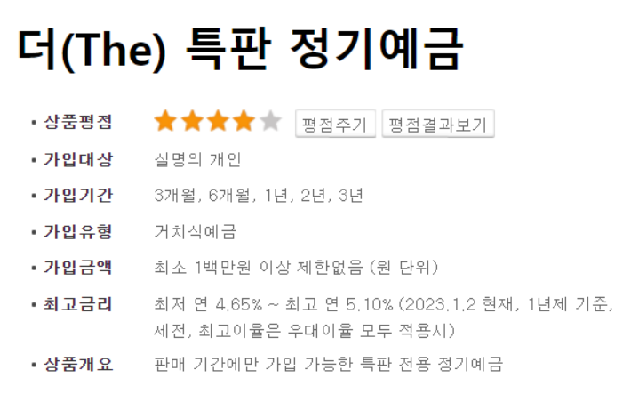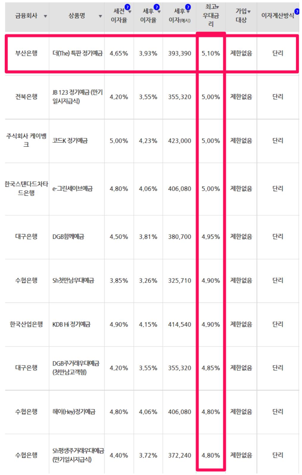 부산은행 더(The)특판 정기예금은 기본 금리가 4.65%이고 우대 금리가 최고 5.10%으로 가장 높습니다.