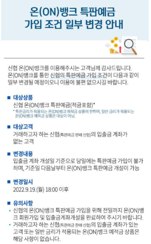 금융 시장에서 정기예금 금리가 고점 대비 점점 낮아지고 있다고는 하나 상호 금융권에서는 여전히 시장 대비 높은 금리의 정기예금 상품을 만날 있어 인기가 있습니다. 특판 상품의 경우에는 판매가 일찍 종료되는 경우가 많으니 거래를 하시기 전에 해당 지점에 유선으로 확인해 보시고 거래하시면 더욱 도움이 될 것 같습니다.
