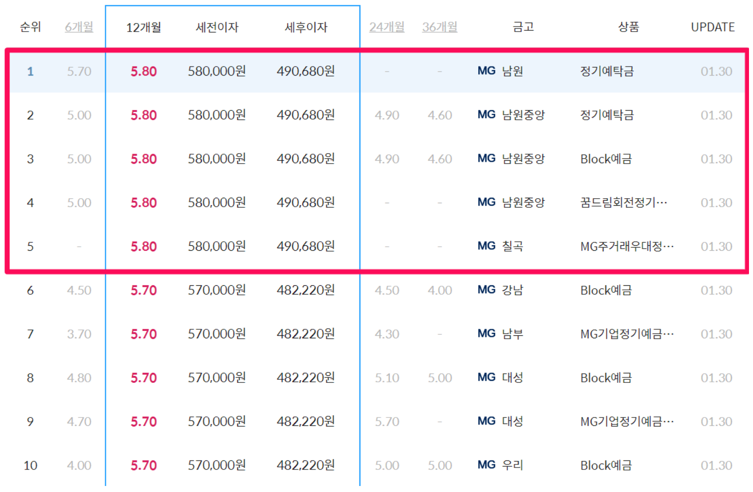 새마을금고 예금금리 가장 높은 곳은 2월 기준, 나주동부새마을금고입니다. MG기업정기예금의 경우에는 5.7%까지 예금금리가 가능합니다.