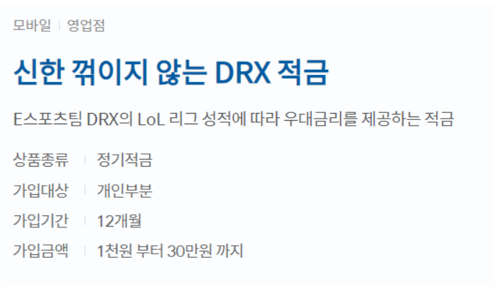 신한은행의 신한 꺾이지 않는 DSX적금은 월 납입액이 30만원 이하이며 가입 기간이 12개월입니다. E스포츠팀 DRX의 LoL 리그 성적에 따라 우대금리를 제공하는 정기적금입니다.