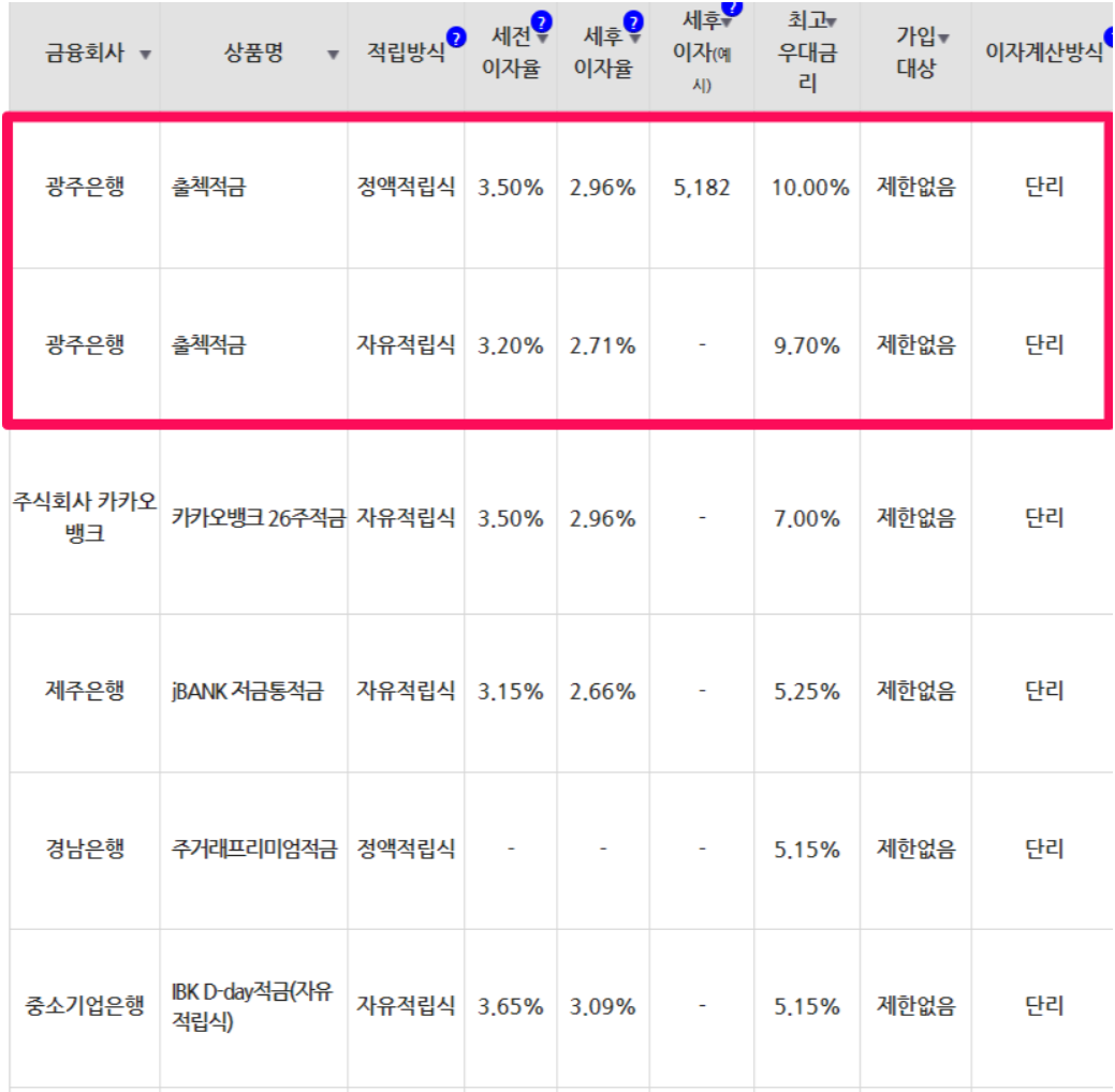 6개월 만기 적금 금리 높은 곳은 연 10%, 9.7%의 광주은행입니다.