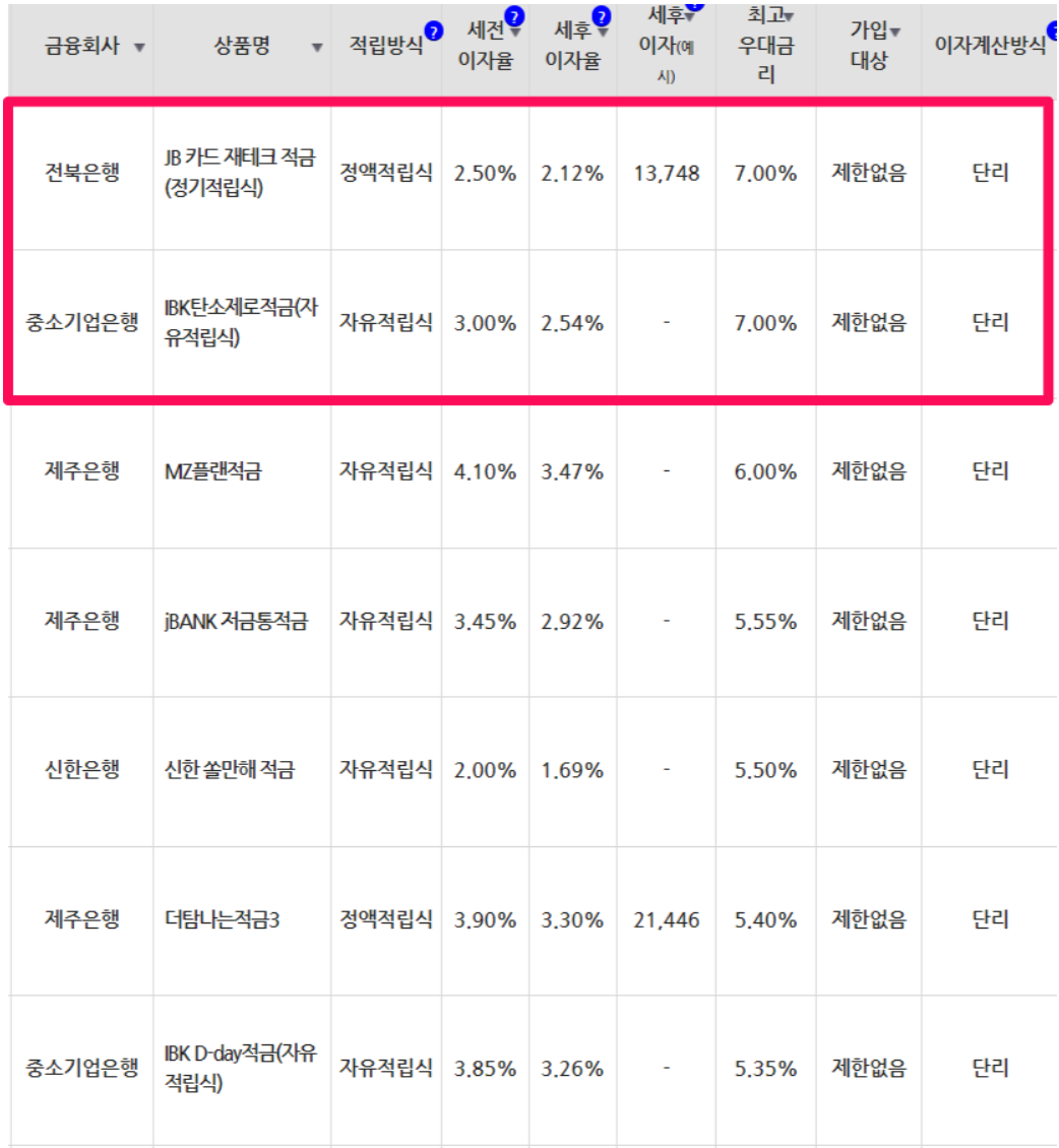 12개월 만기 적금 금리 높은 곳은 연 7%의 전북은행, 중소기업은행입니다.