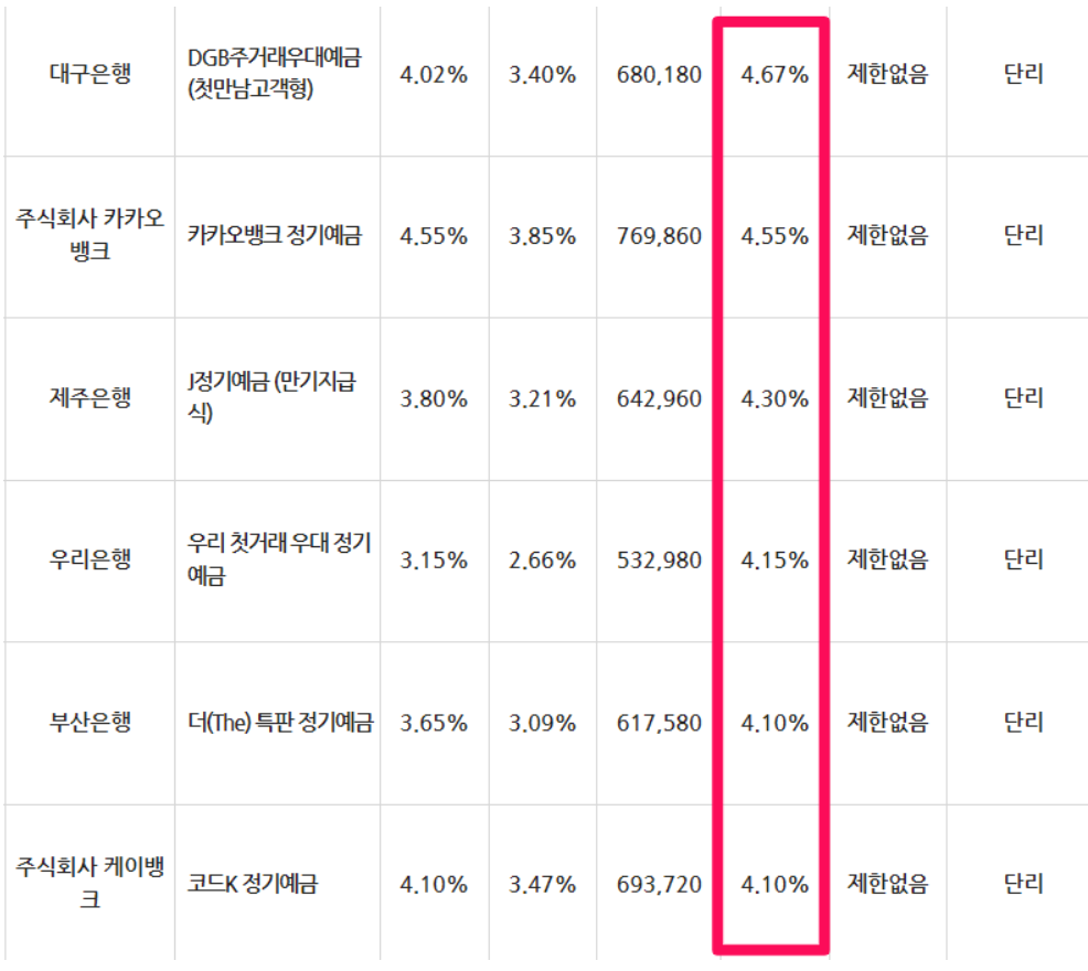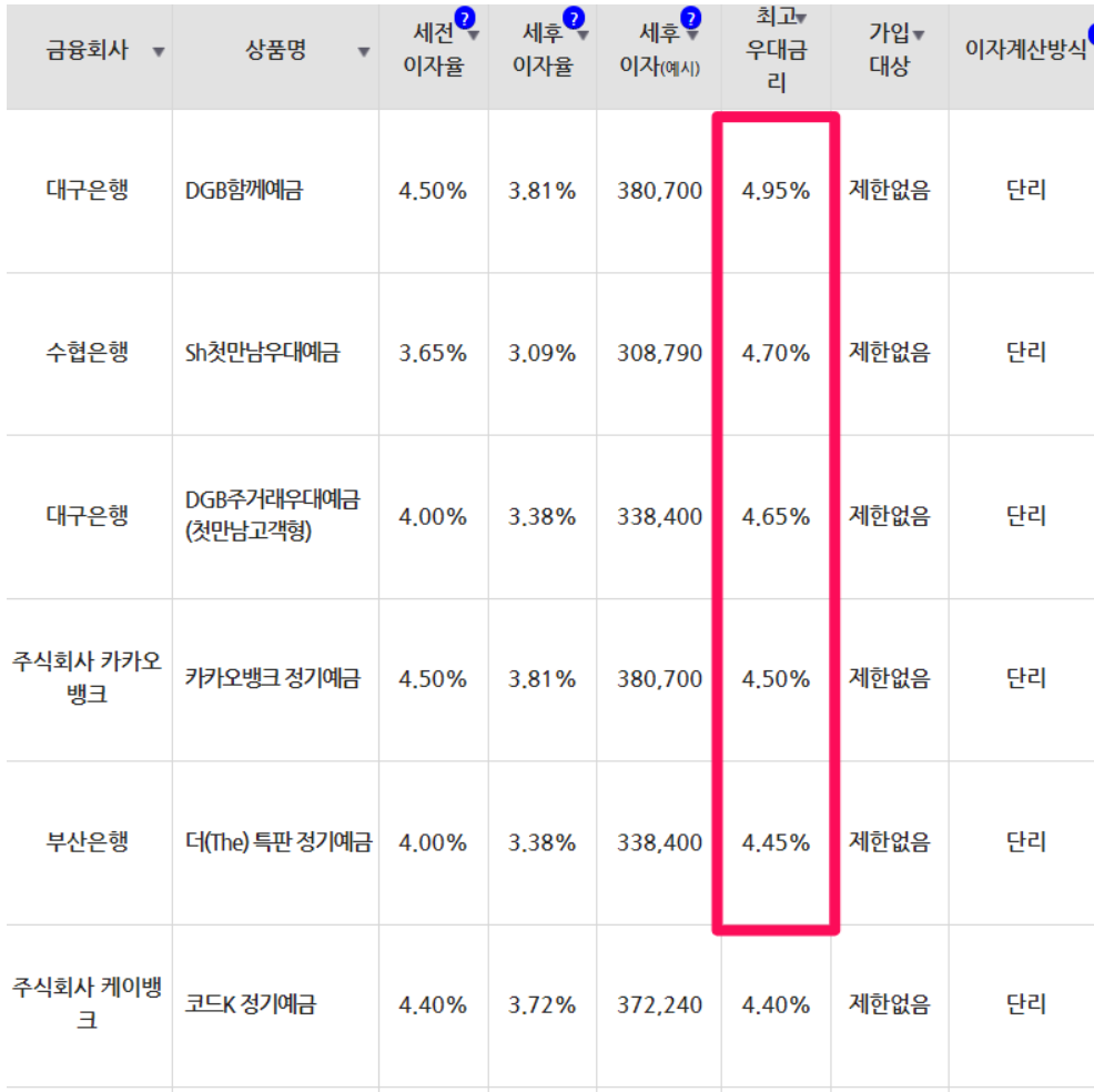 우대 예금 금리 가장 높은 곳은 금리 4.75%의 대구은행과 4.70%의 수협은행입니다.