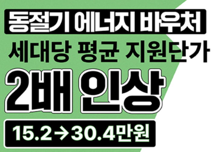 최근 전세계적인 에너지 가격 급등으로 난방비 상승에 대한 사회적 우려가 높은 만큼 정부에서는 에너지바우처 지원금액 중 올겨울 한정으로 지원금을 2배로 확대한다고 발표하였습니다. 에너지바우처를 2배로 활용할 수 있는 대안책입니다.