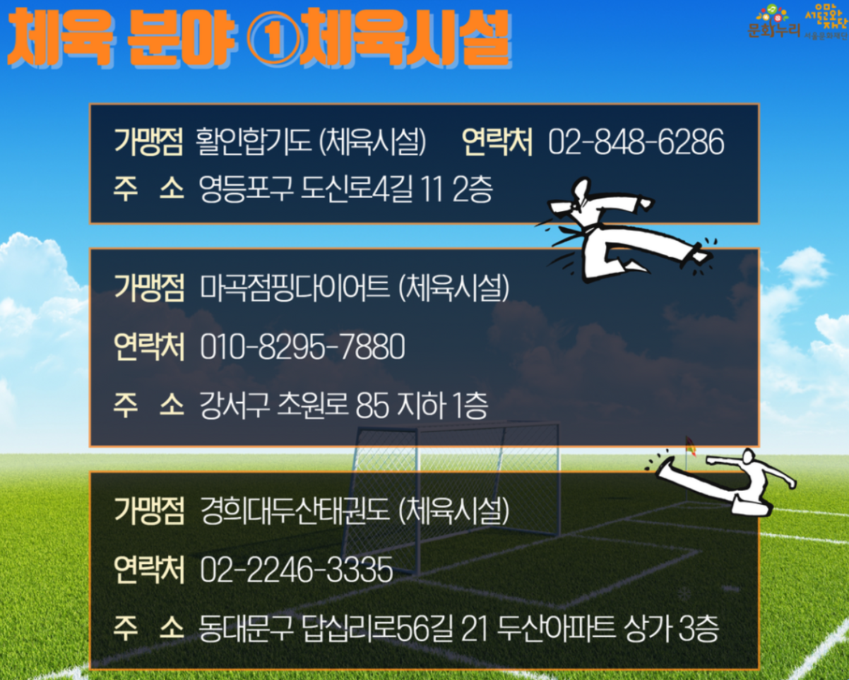 문화누리카드 사용처는 서울지역 뿐아니라 지역 주관처에서 꾸준히 새로운 정보를 추가 등록하게 홈페이지를 통해 게재하고 있습니다. 태권도, 합기도와 같은 체육시설에서 부터 사진관과 서점 등 다양한 가맹점이 꾸준히 업데이트 됩니다.